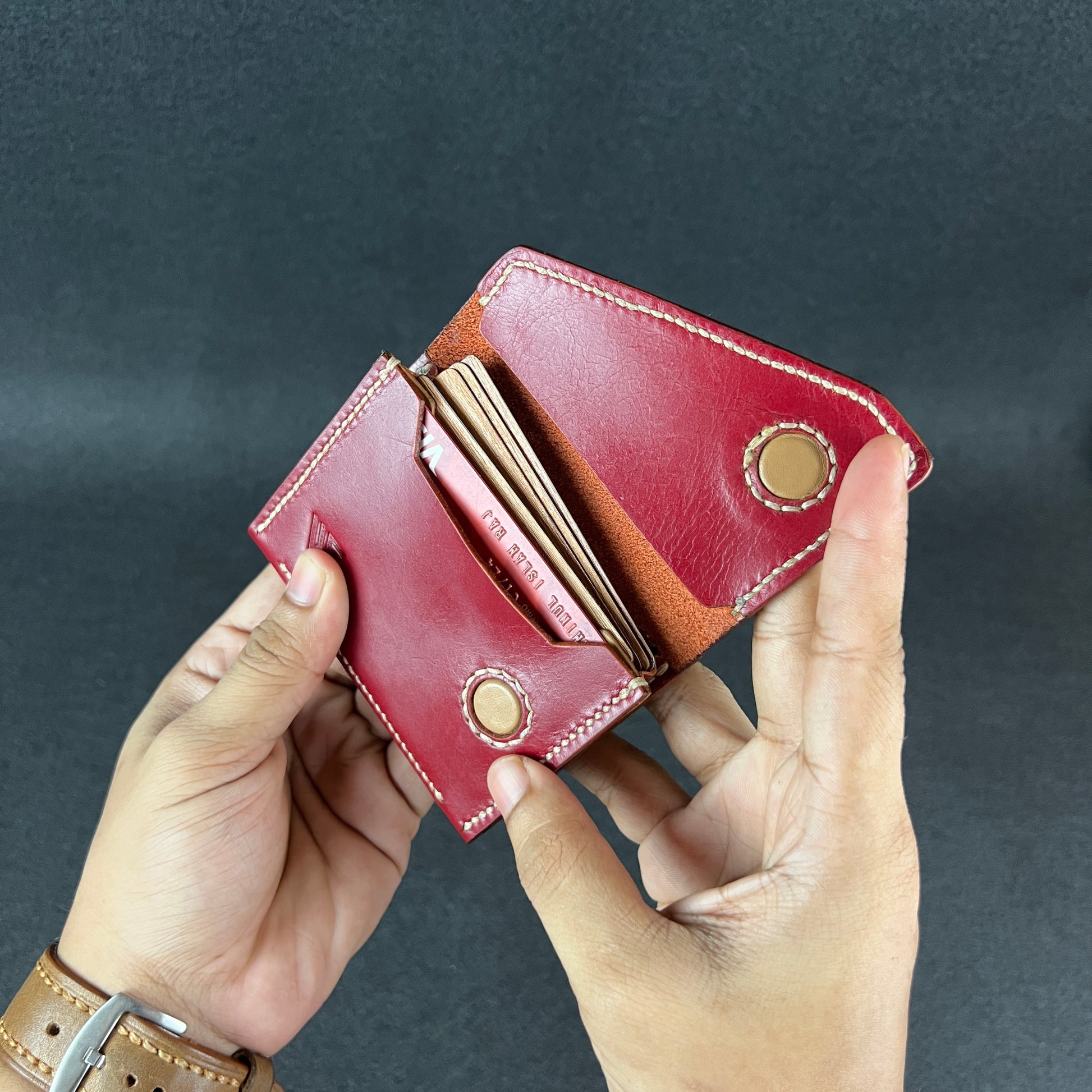 "Customize Your Wallet: Choose you preferred leather type, color, and thread options from our available stock"