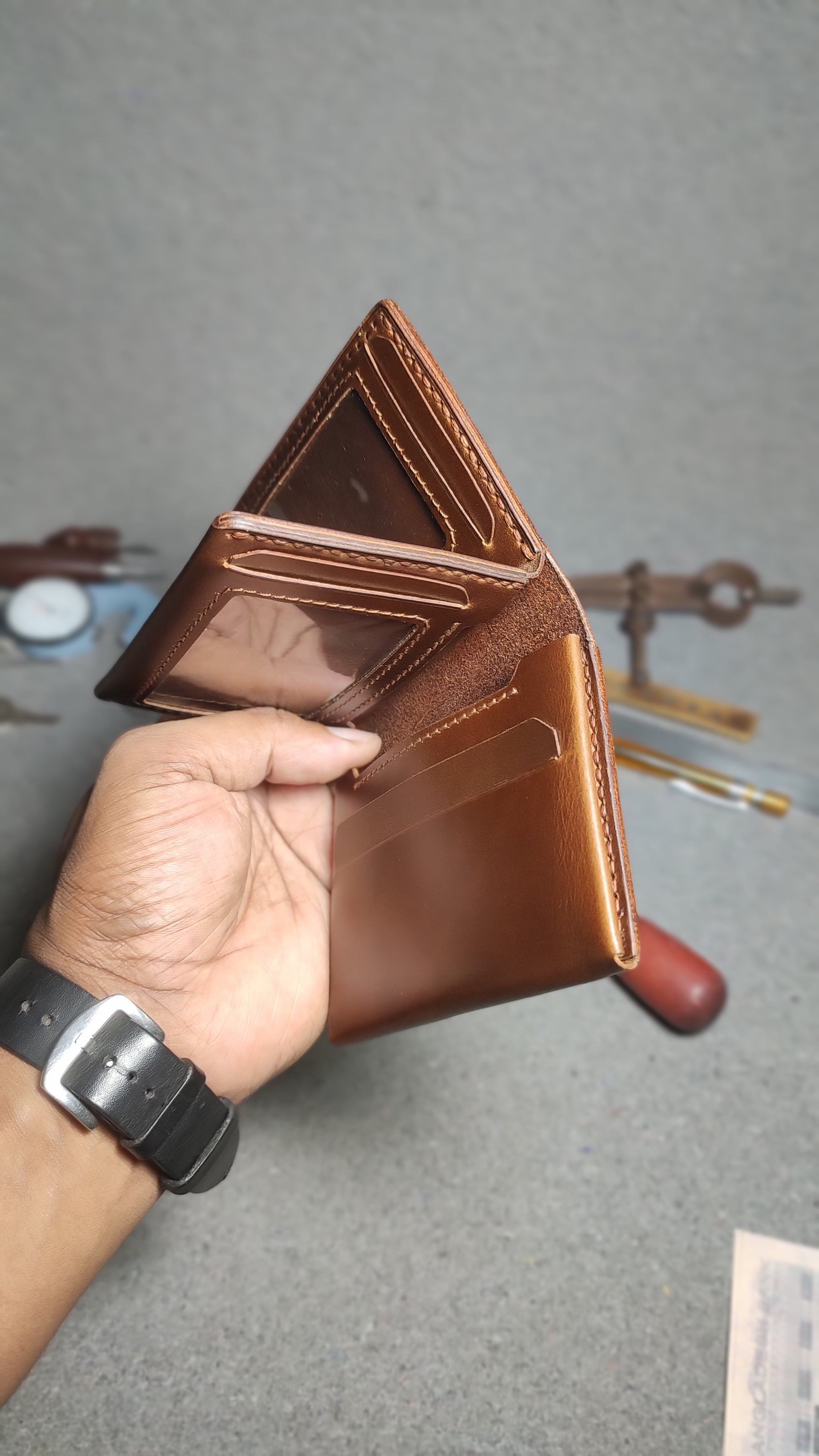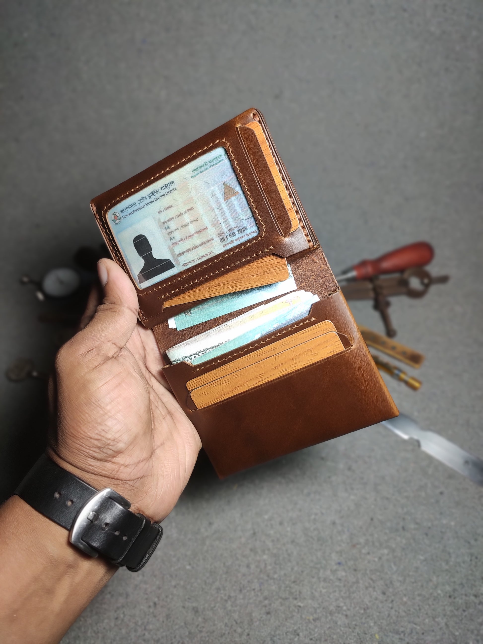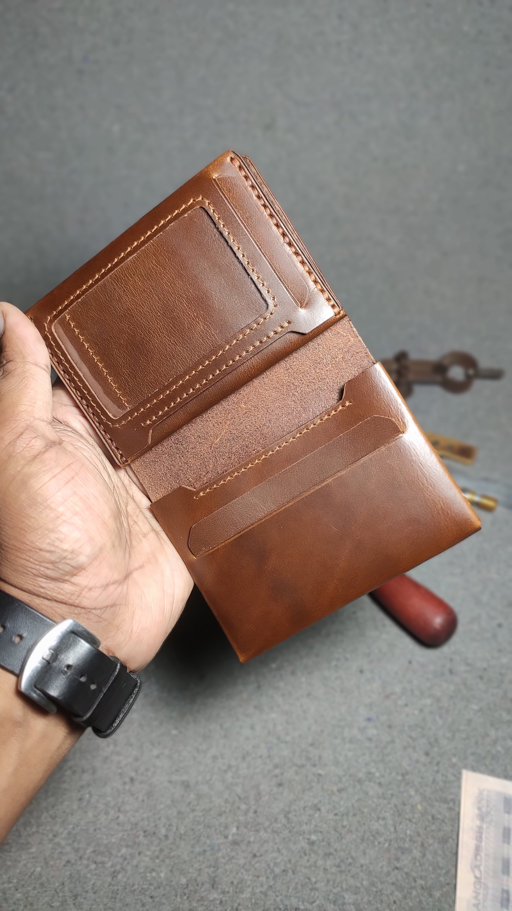 "Customize Your Wallet: Choose you preferred leather type, color, and thread options from our available stock"