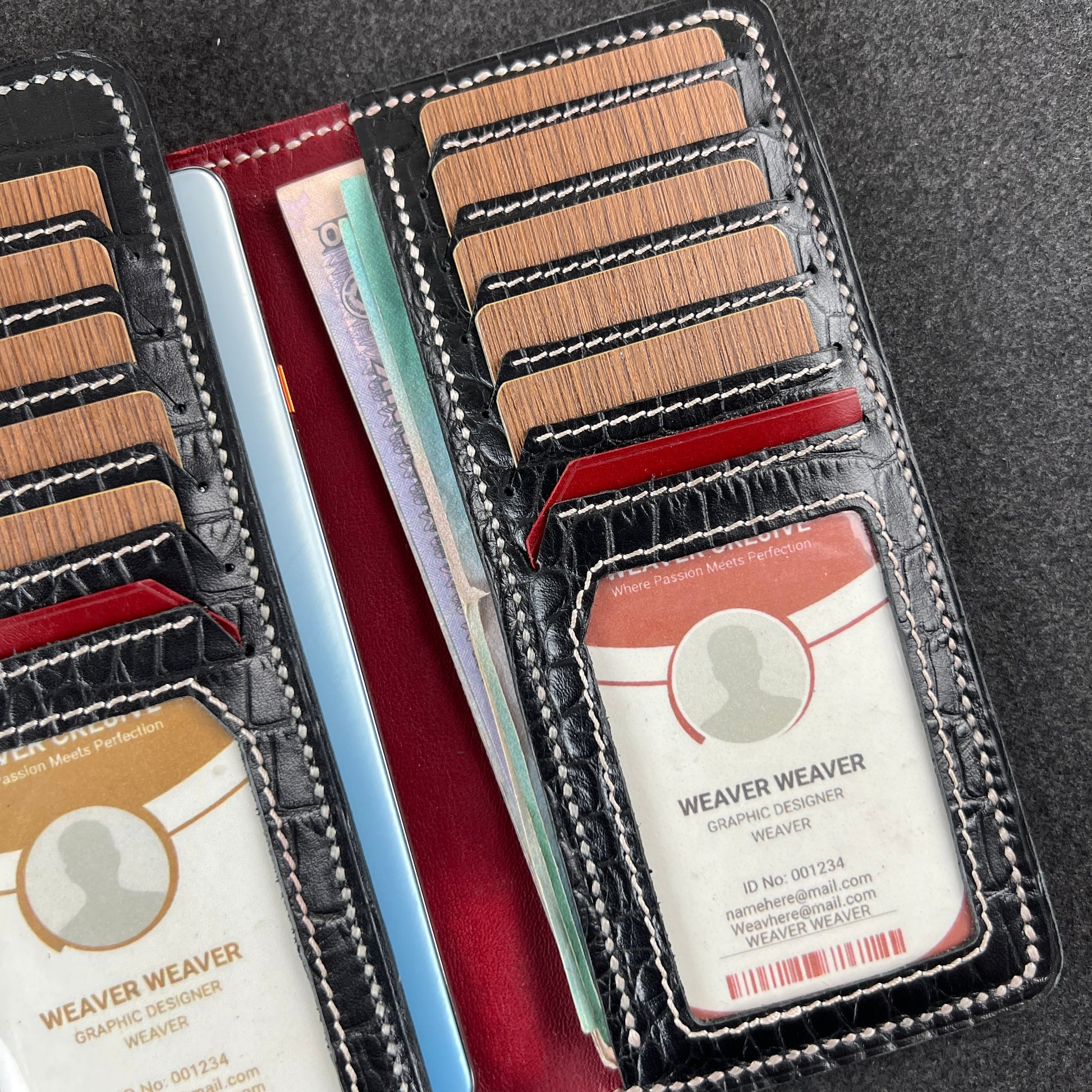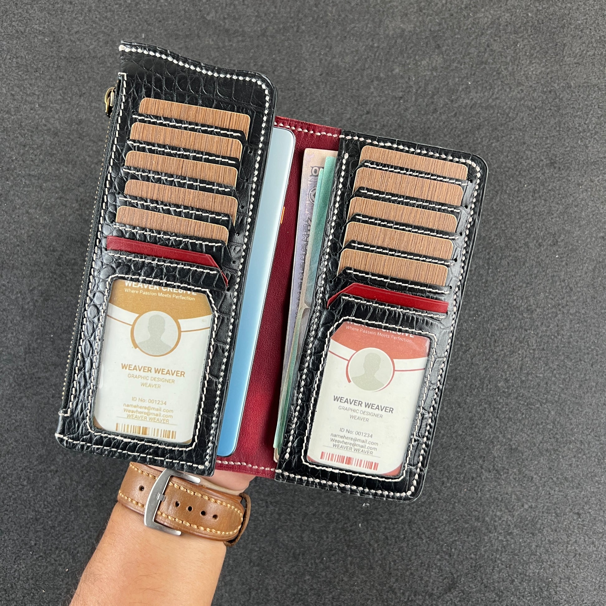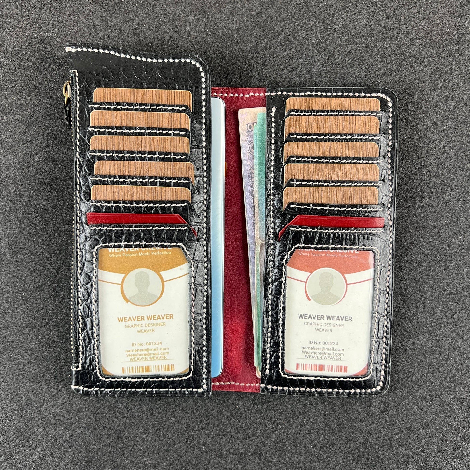 Twin panels lined with crocodile-textured leather. Deep card slots that rise like steps. A full-length zip chamber running along the edge—ready for bills, coins, or whatever life throws in your pocket that day. ID windows sit at the base of each side, framed with clean angles and confident stitching. Everything inside feels intentional, structured, and surprisingly spacious.