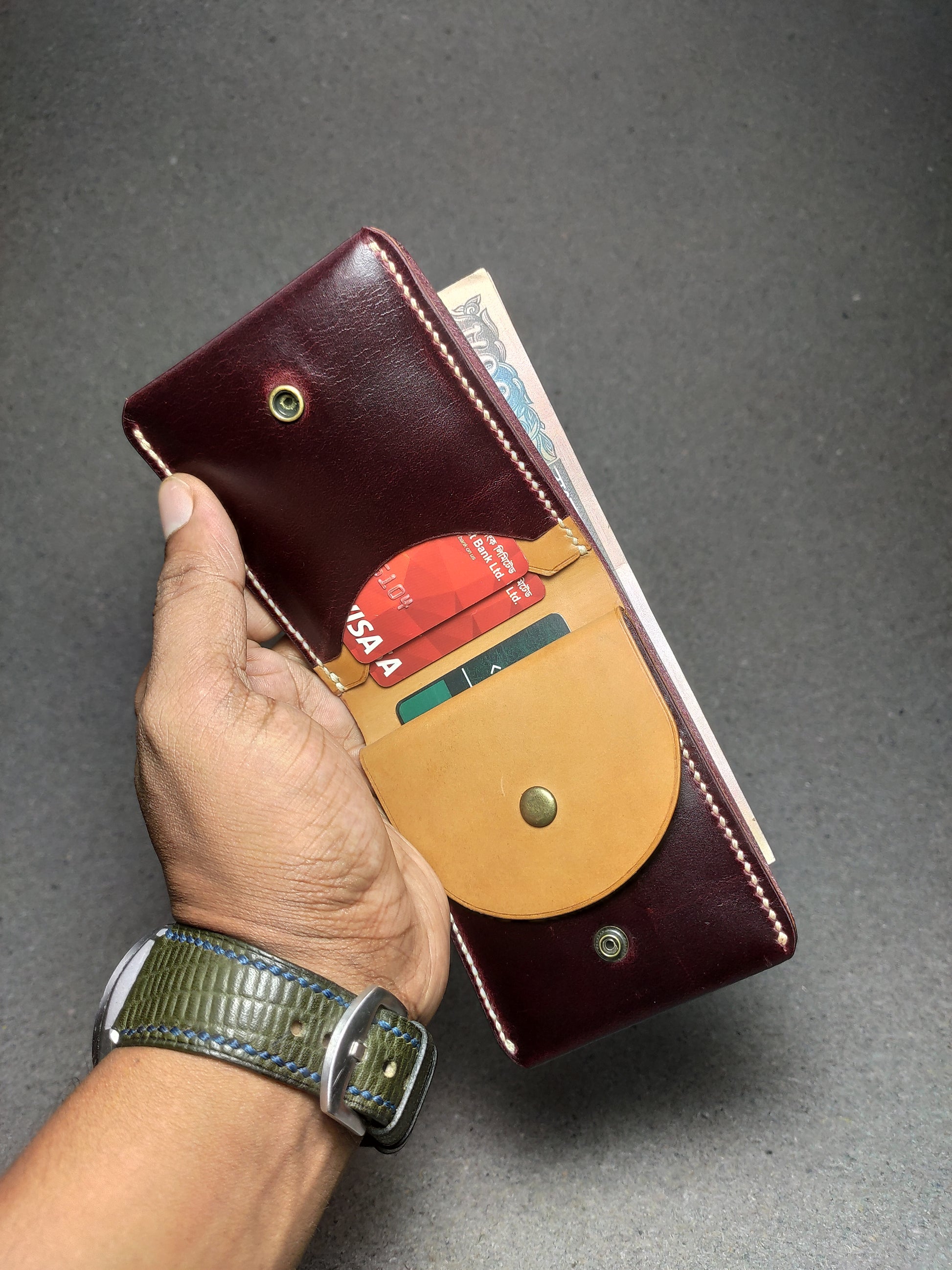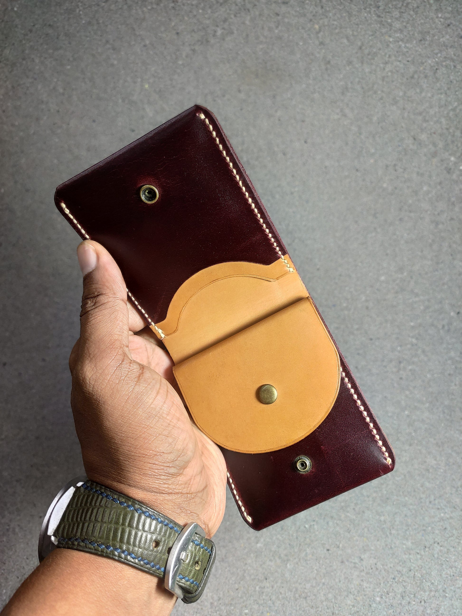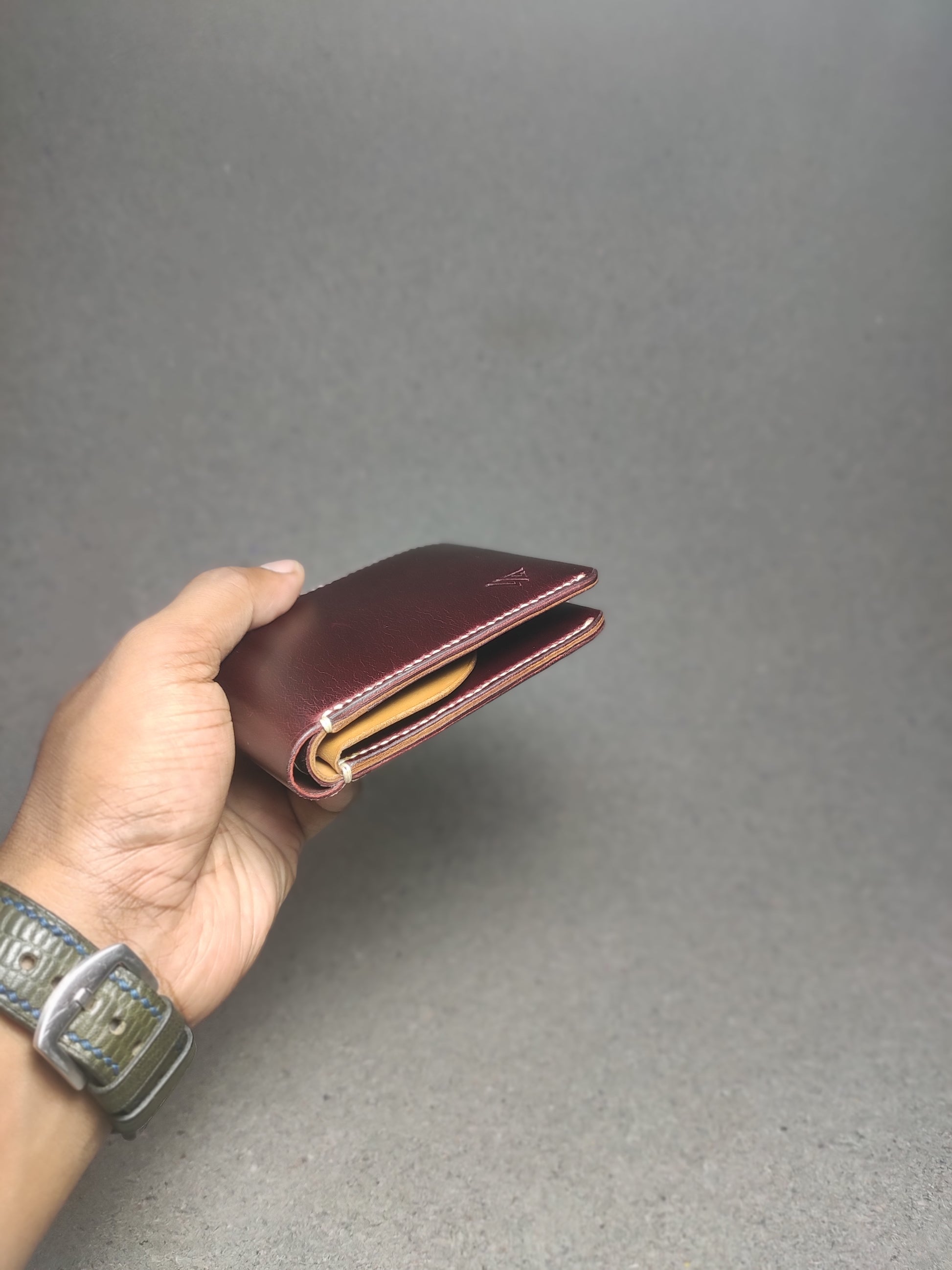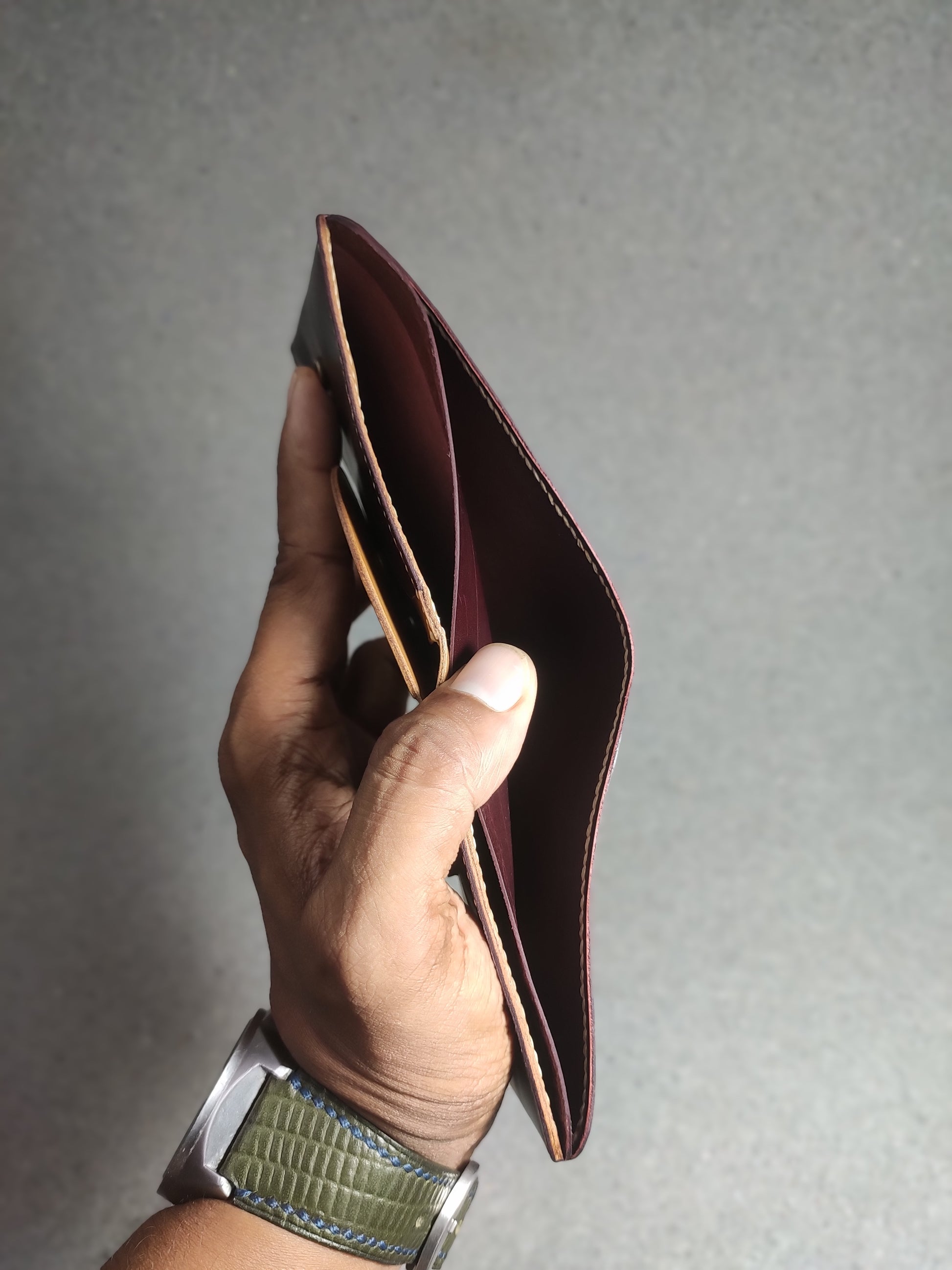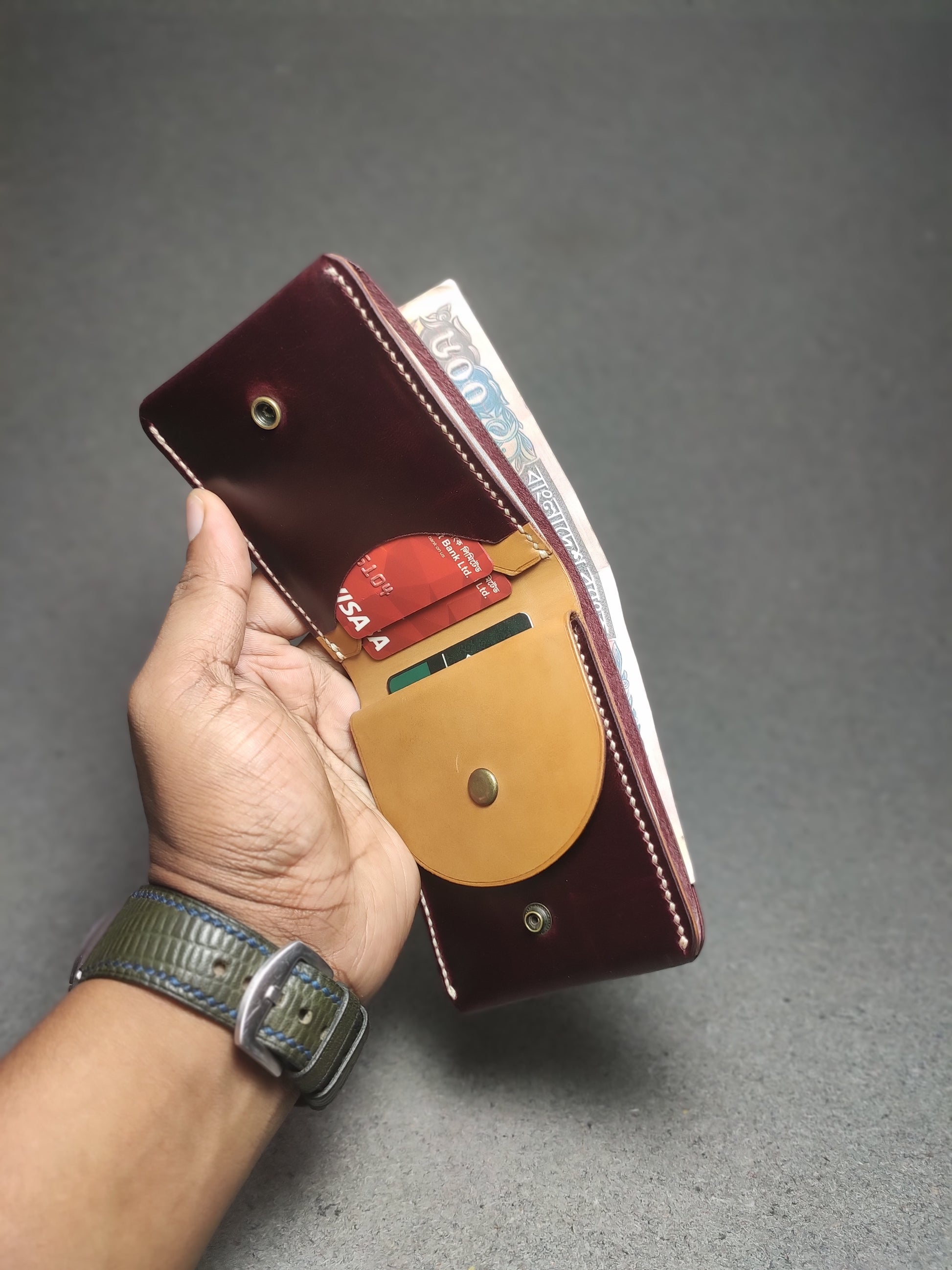 Two cash chambers, two primary card slots, and a clever CC pocket—balanced with a snap-button coin pouch that opens like a whisper and closes with certainty. Every edge is hand-burnished. Every thread placed with care. Every fold, an invitation to slow down.