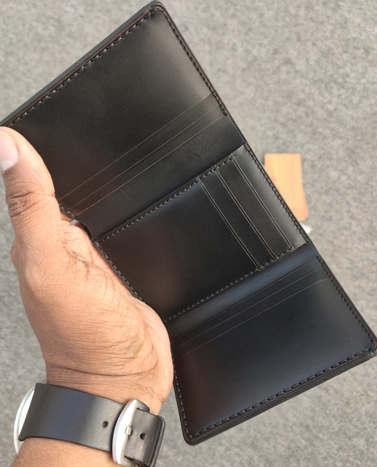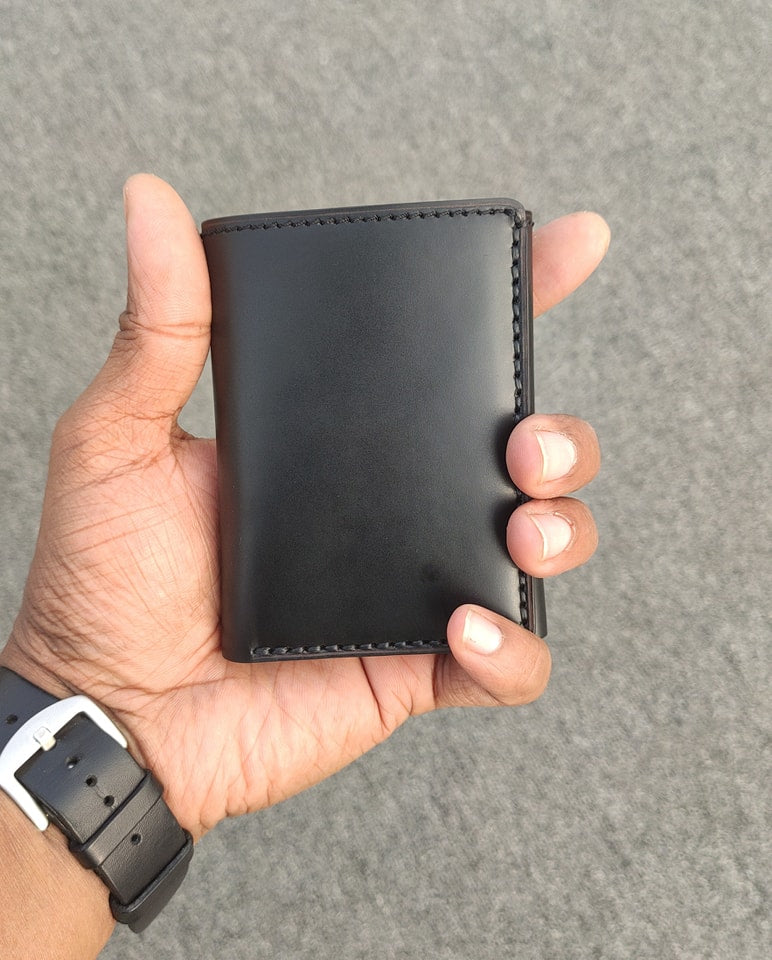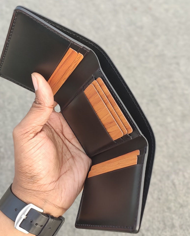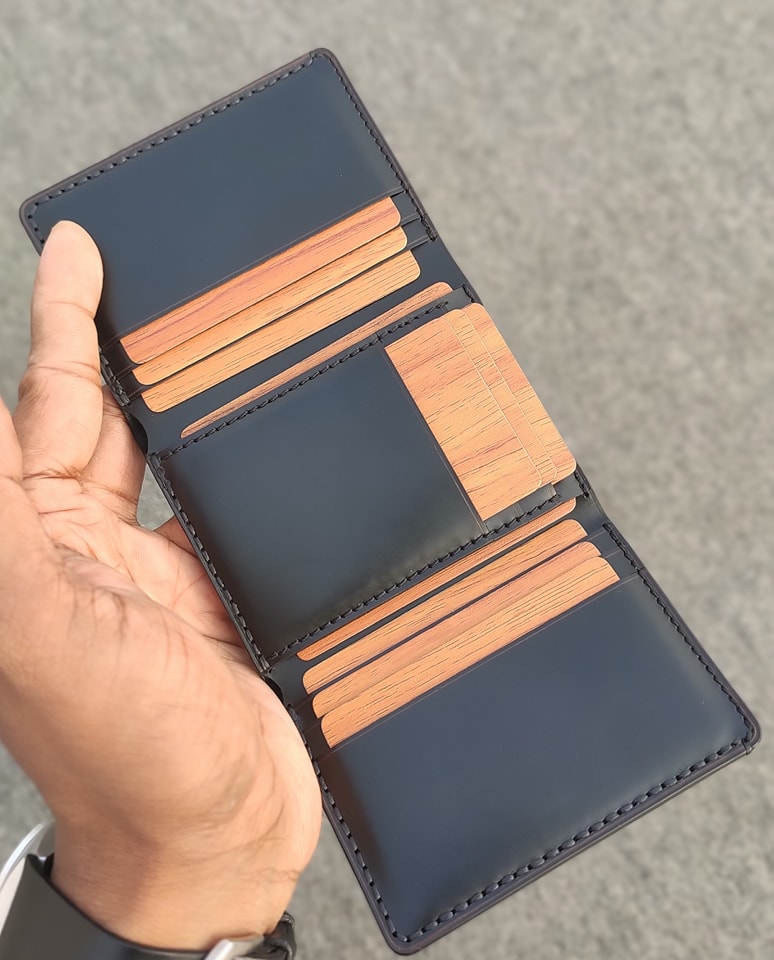 "Customize Your Wallet: Choose you preferred leather type, color, and thread options from our available stock"