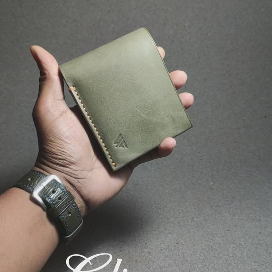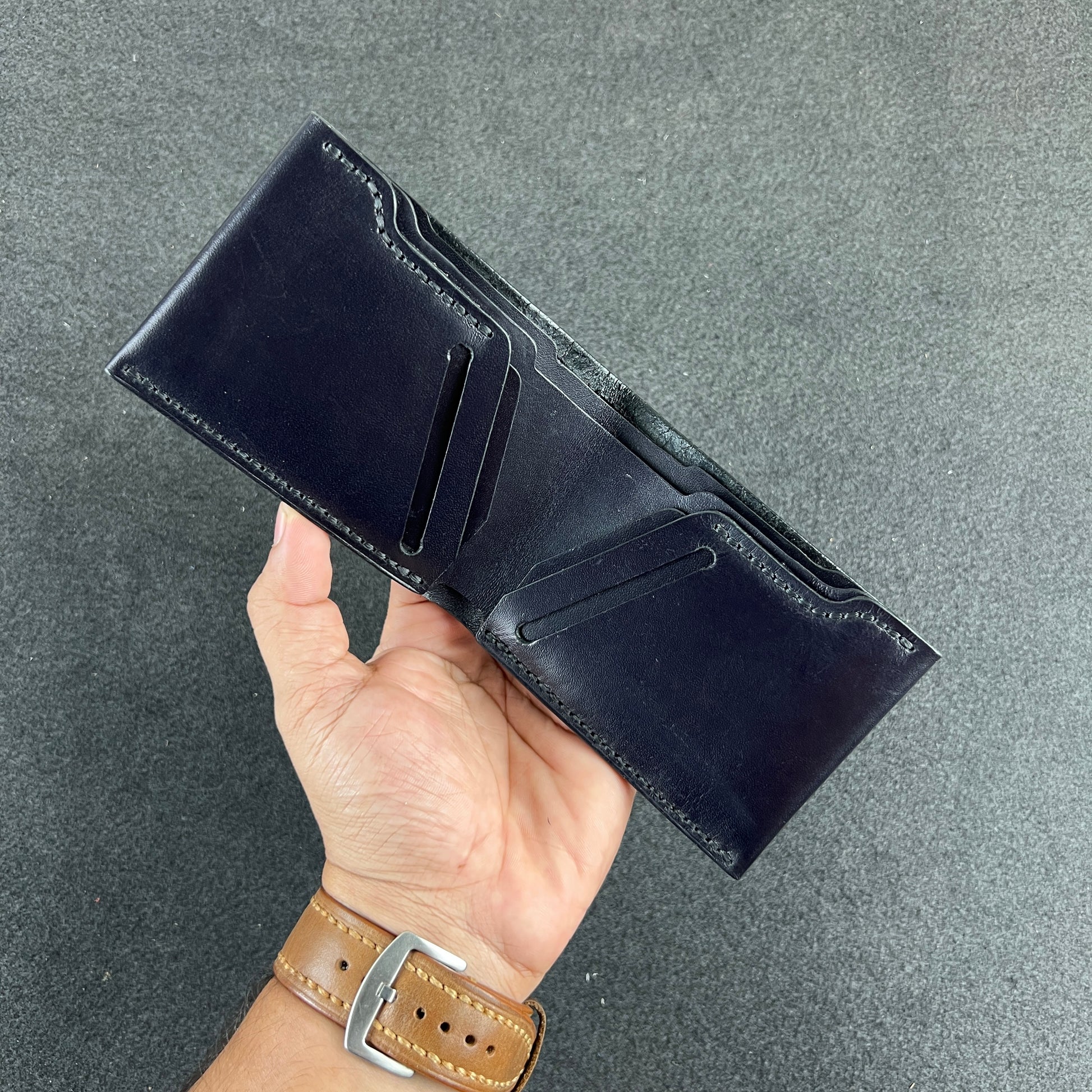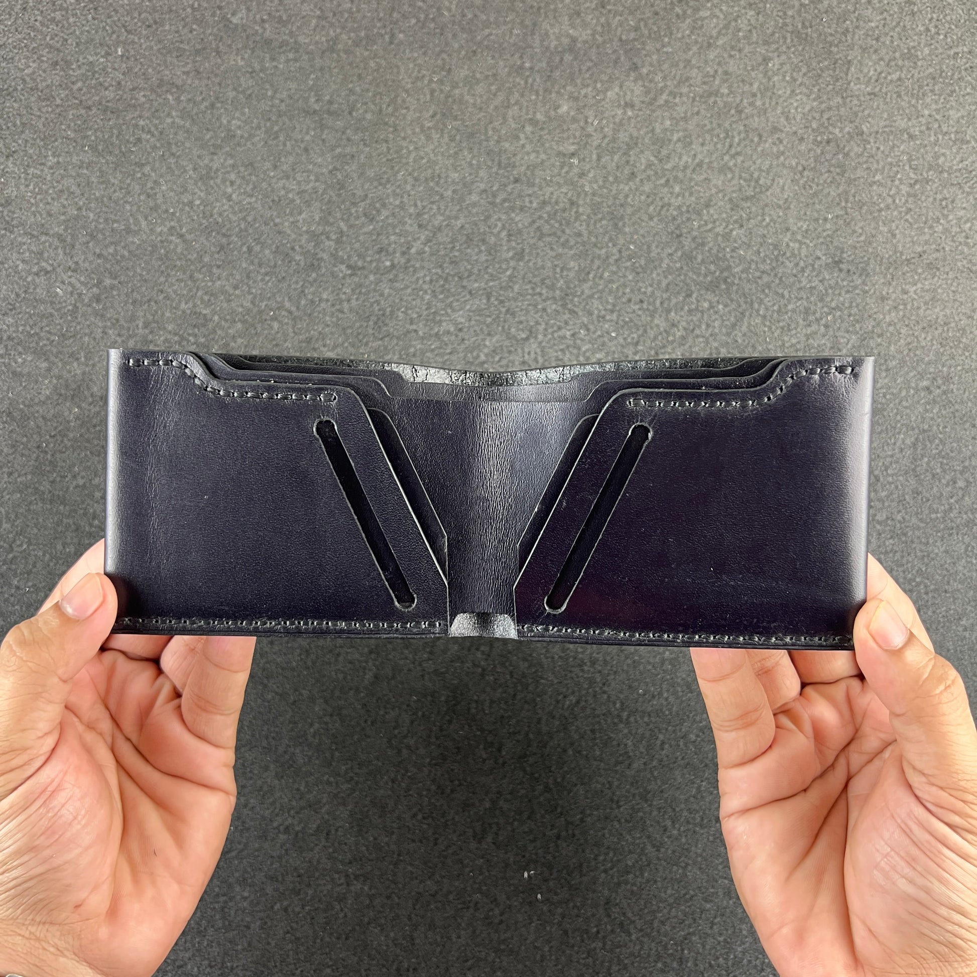 Two spacious cash chambers and four card slots are nestled within premium veg-tanned crazy horse leather—stitched entirely by hand, burnished to precision, and sized to slip easily into your palm or pocket.