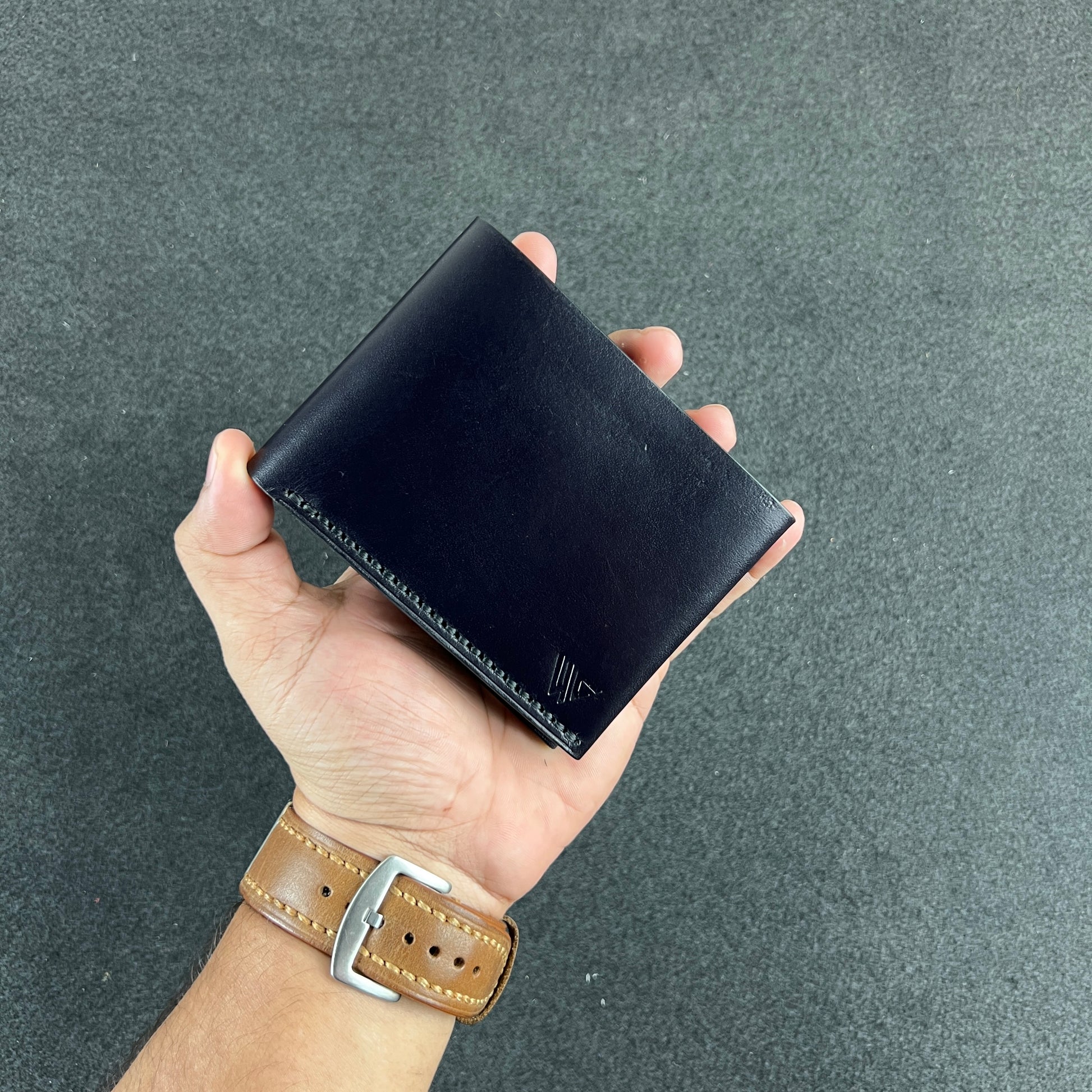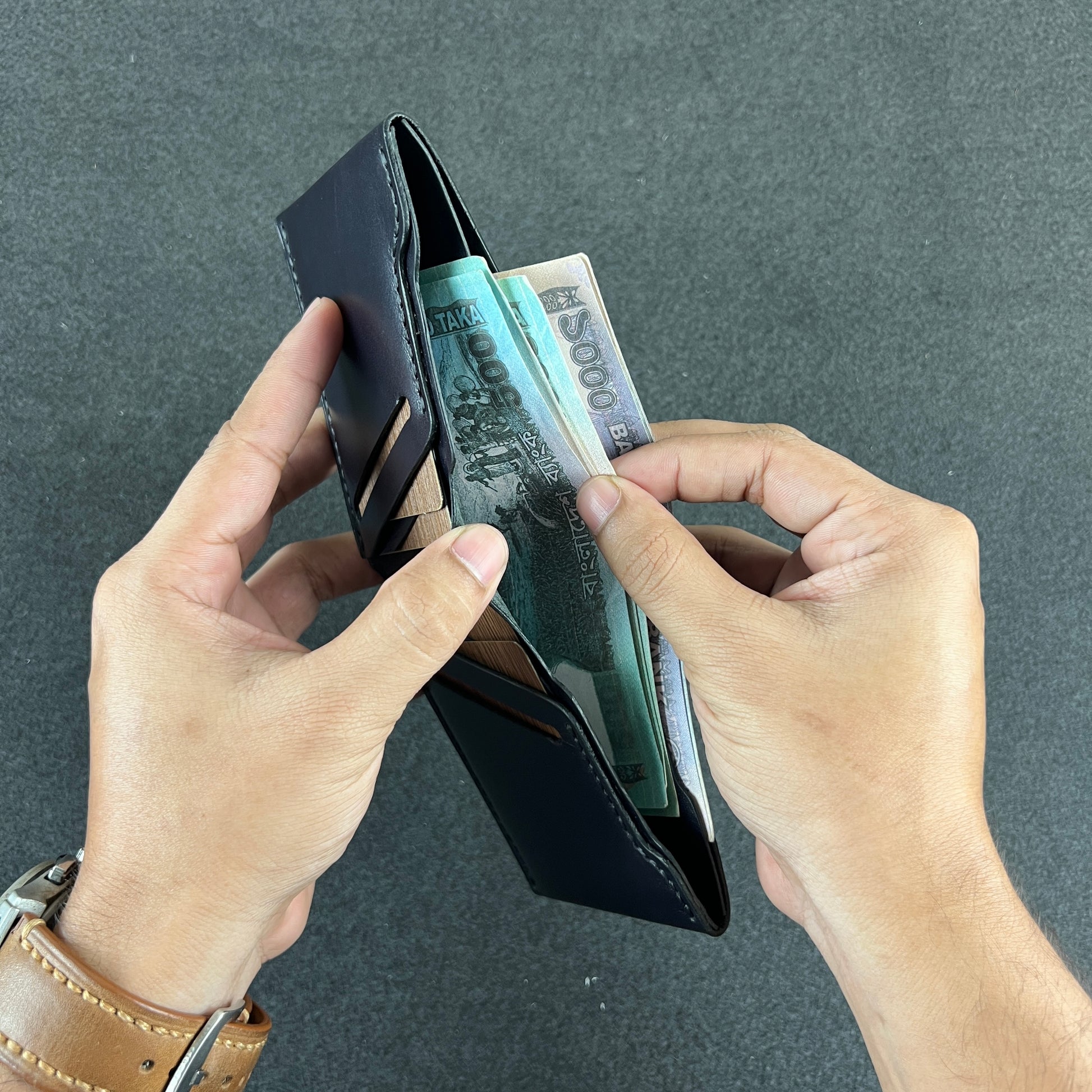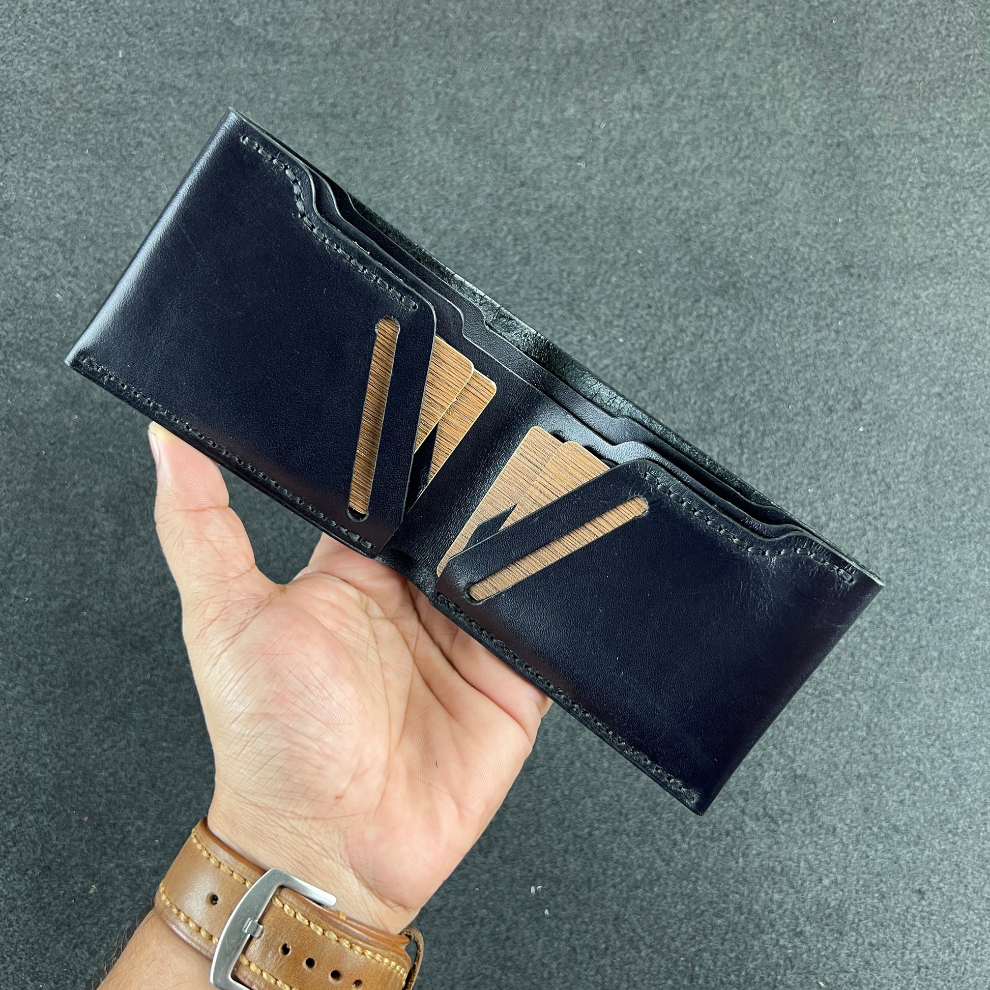 Two spacious cash chambers and four card slots are nestled within premium veg-tanned crazy horse leather—stitched entirely by hand, burnished to precision, and sized to slip easily into your palm or pocket.
