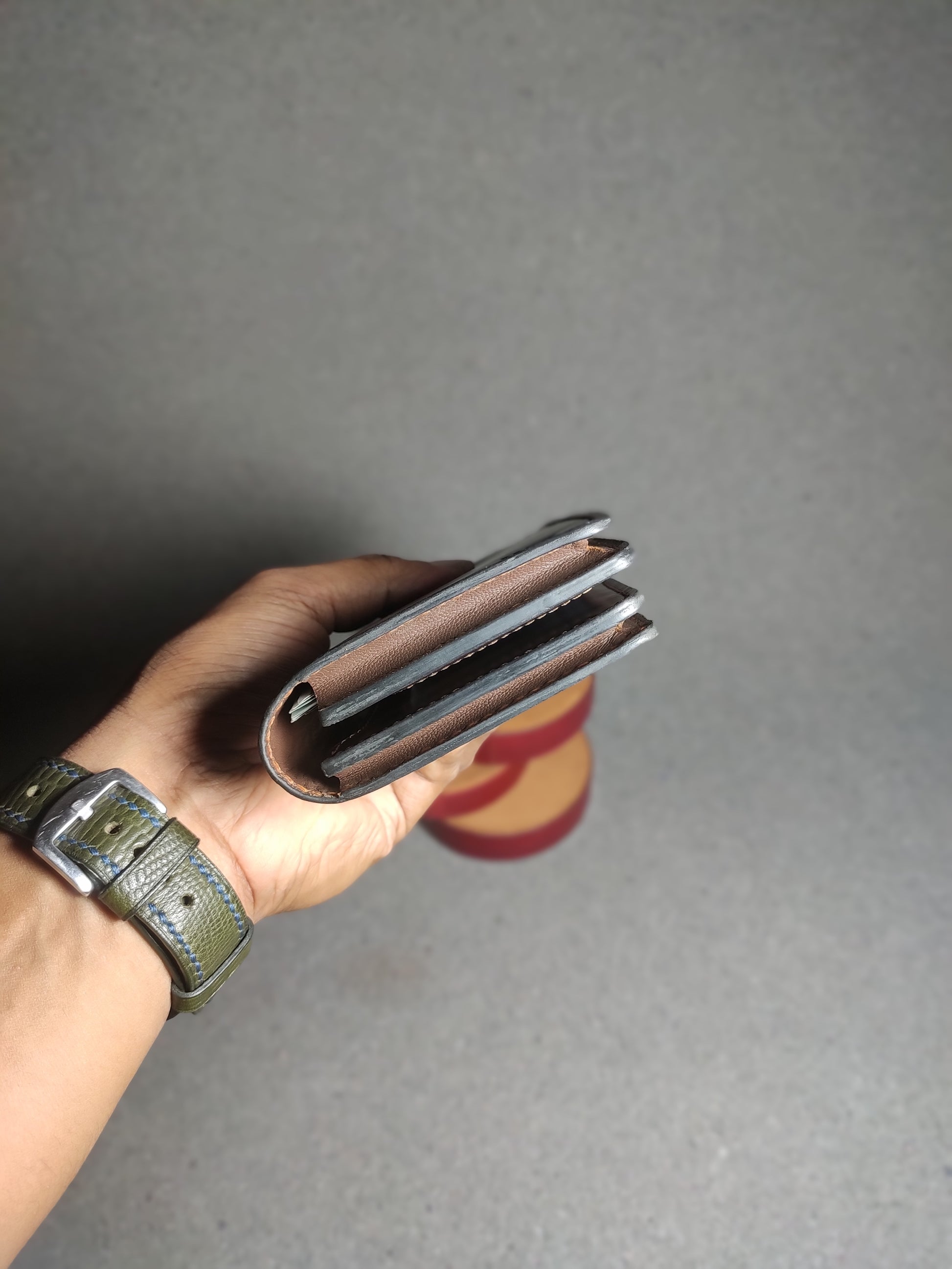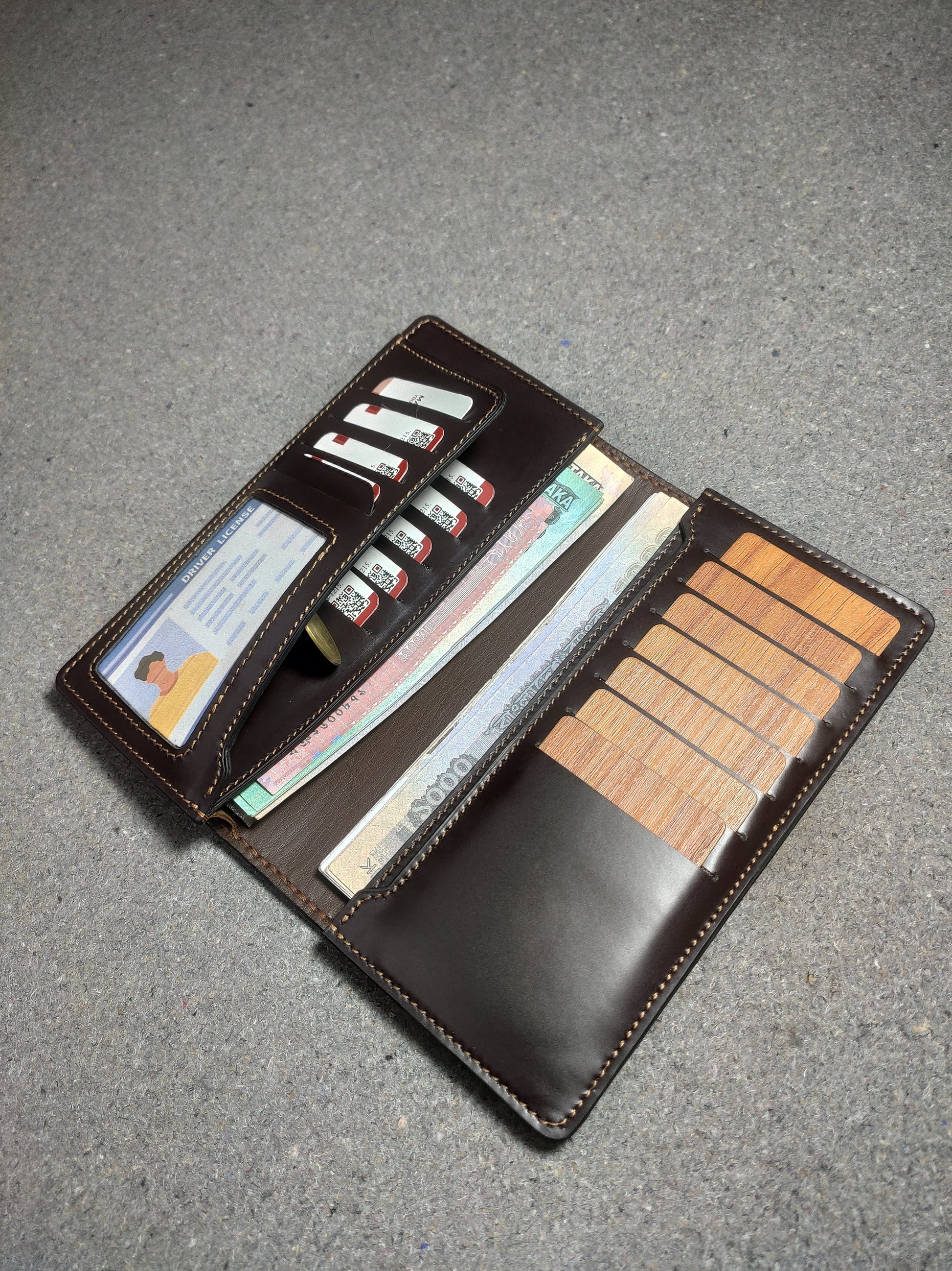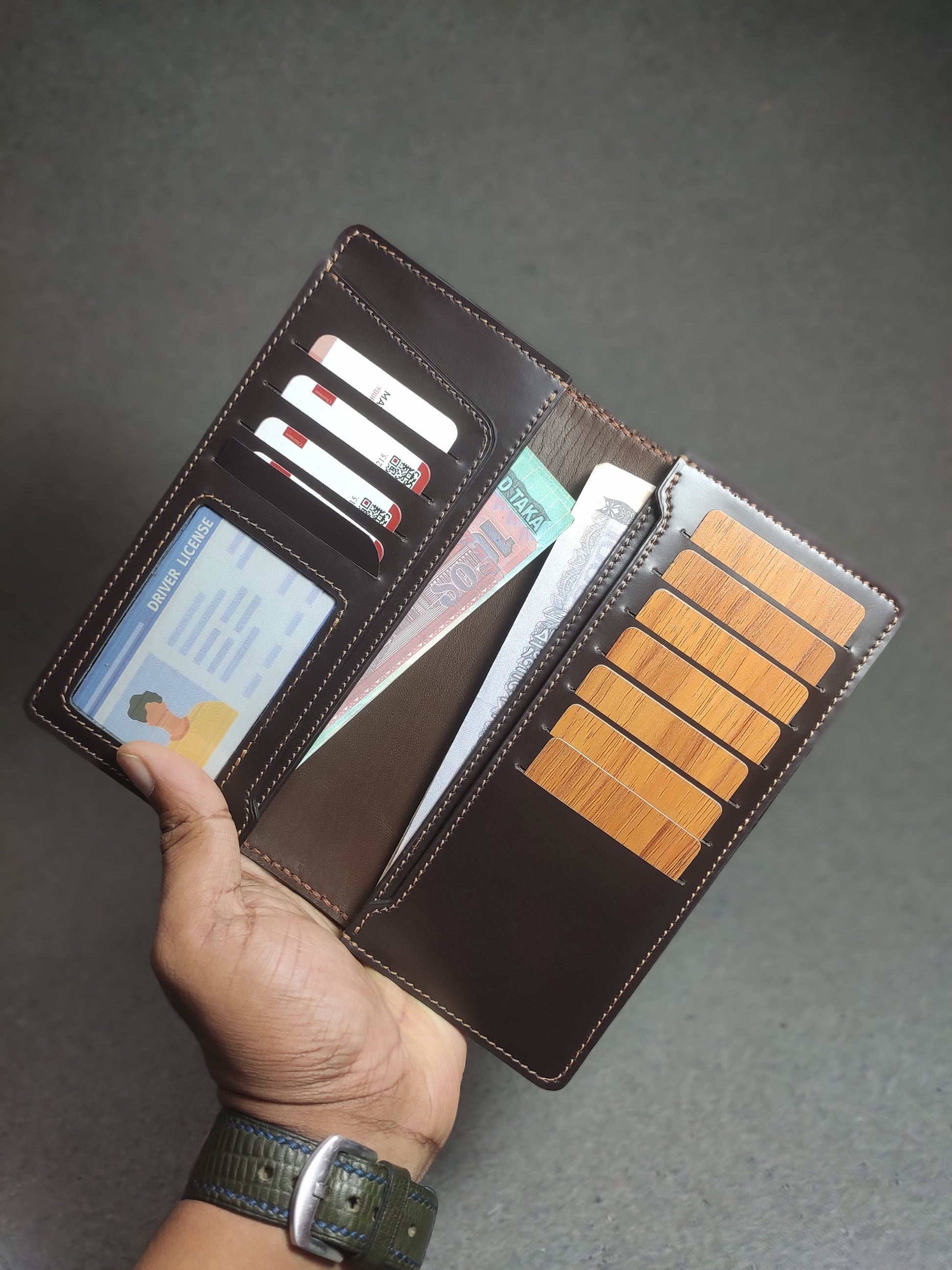 "Customize Your Wallet: Choose you preferred leather type, color, and thread options from our available stock"